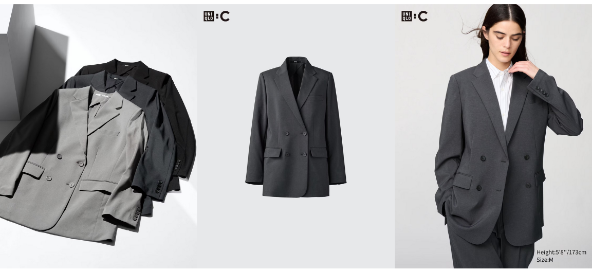 A fusion of Gen Z’s love for oversized silhouettes and a courier-delivered package containing a piece from Uniqlo : C – a collaboration with modern-classic British designer Clare Waight Keller. The star of the moment? A double-breasted suit for HER (AirSense Relaxed Tailored Jacket + AirSense Pleated Wide Trousers in 08 Dark Grey).